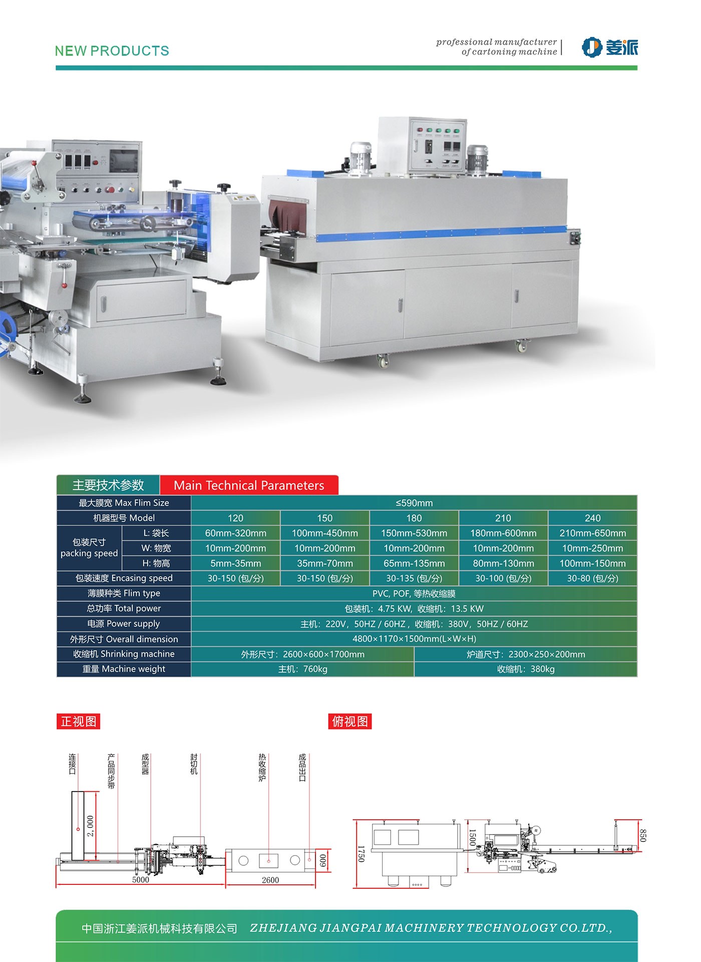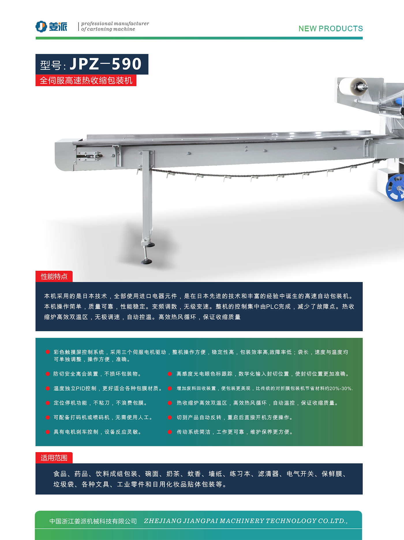 本机采用的是日本技术,全部使用进口电器元件,是在日本先进的技术和丰富的经验中诼生的高速自动包装机。本机操作简单,质量可靠,性能稳定。变频调数,无级变速。整机的控制集中由PLC完成,减少了故障点。热收缩炉高效双温区,无极调速,自动控温。高效热风循环,保证收缩质量